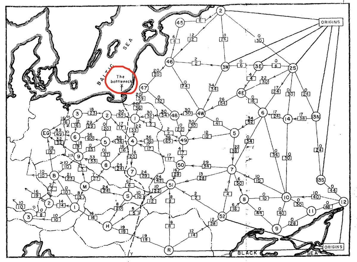 These bottlenecks (a minimal set of critical rail lines) were, of course, of interest to the US Air Force. They summarize:
